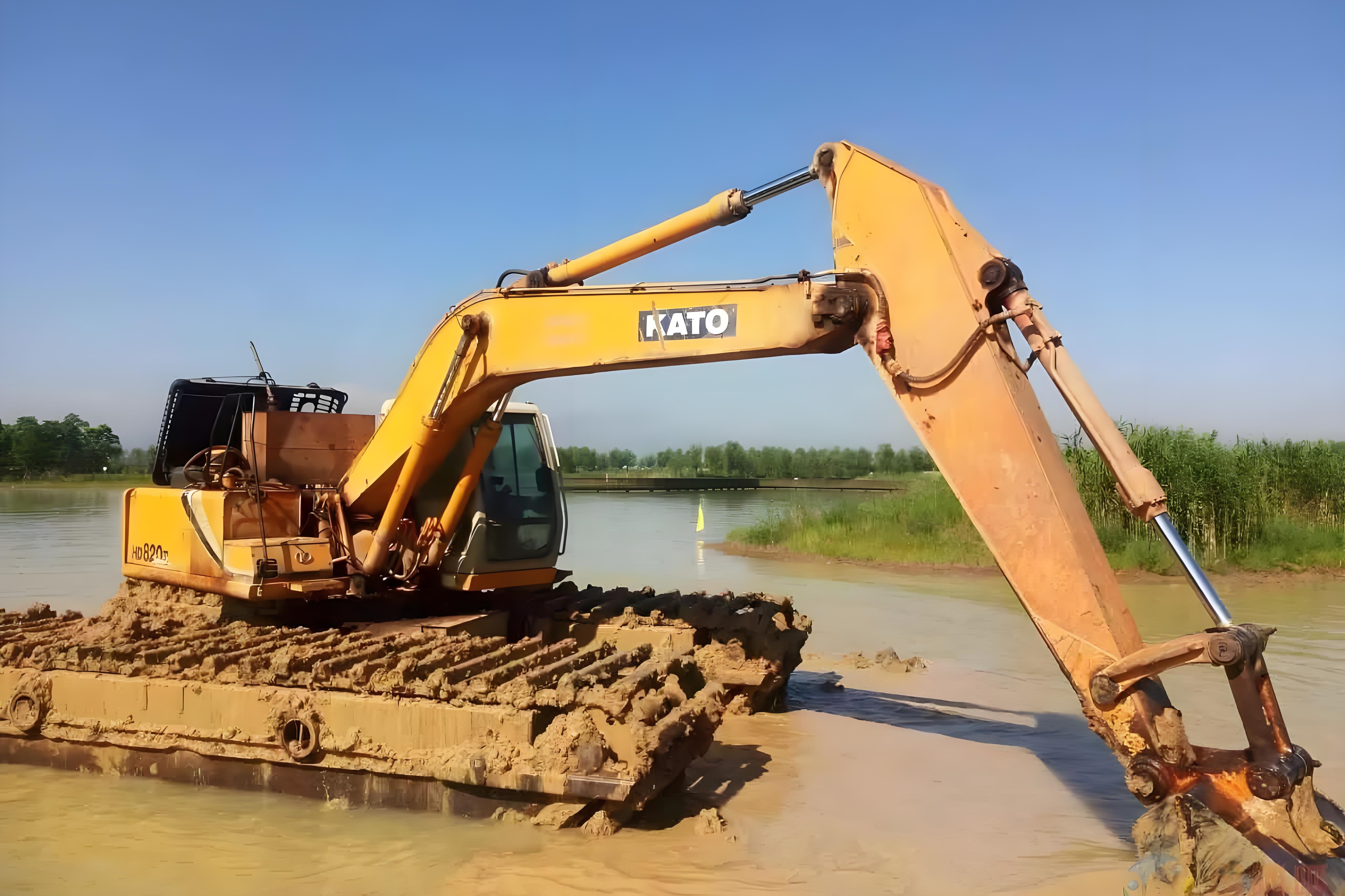 如果魚塘不想放水(比如里面還有魚苗,或者水源不好補(bǔ)充),就用 “水上挖機(jī)”。這種挖機(jī)底部有浮箱,能直接在水面上作業(yè)。