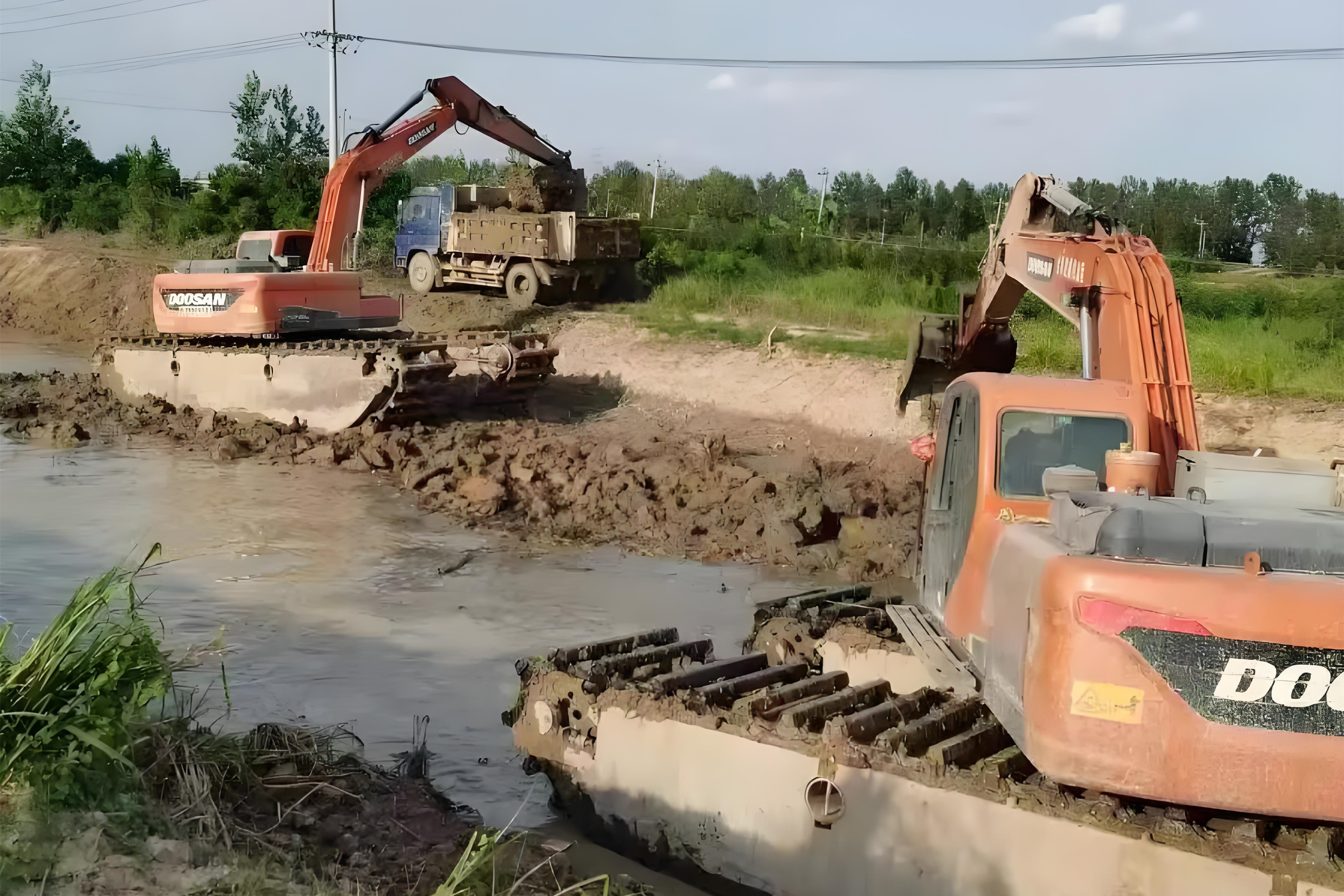 另一類是兩棲挖機(jī),它既能在陸地跑,也能在水里作業(yè),履帶更寬,接地壓力小,在水深不超過(guò) 1.5 米的區(qū)域特別好用。